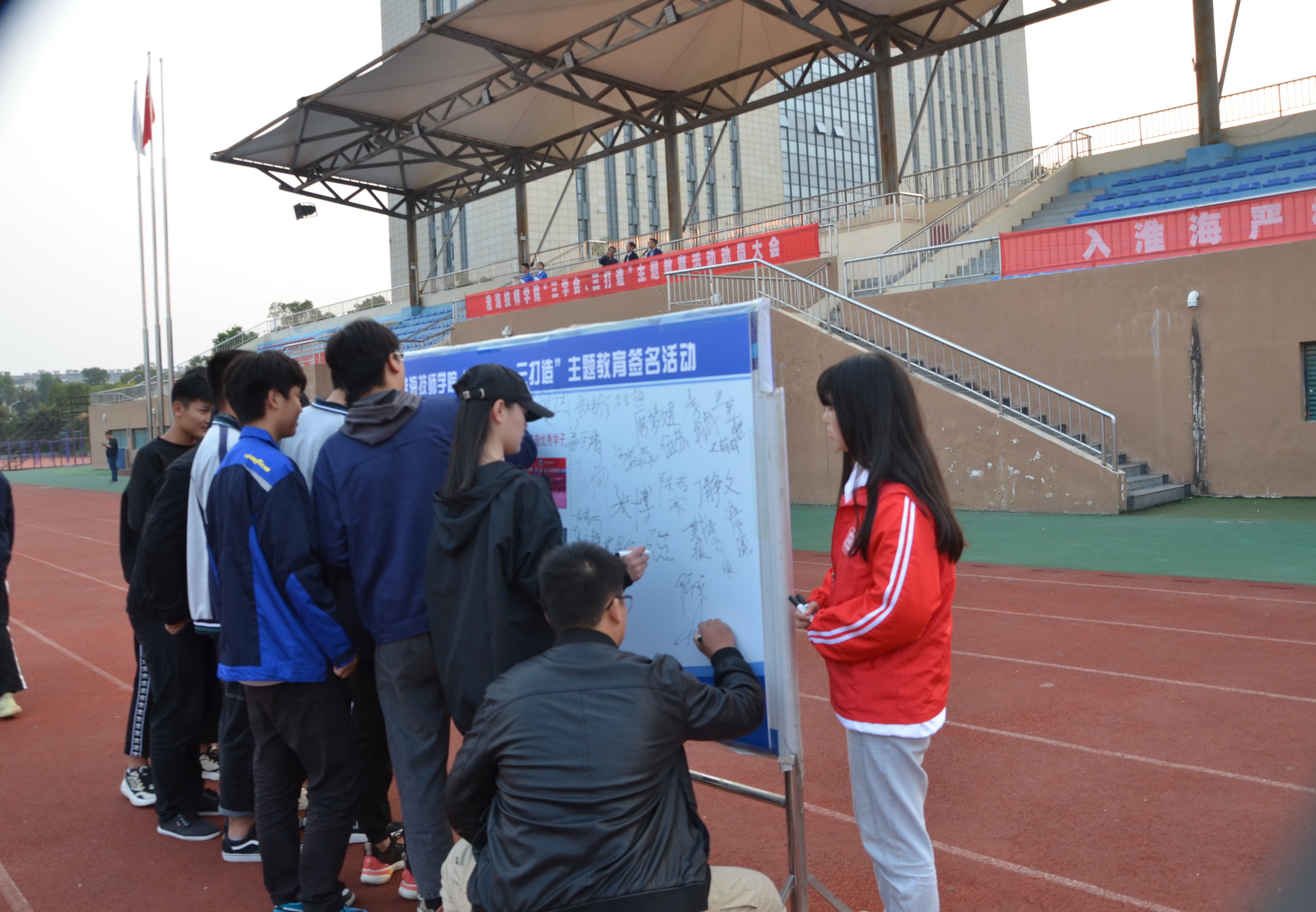 活动结束后,举行了“三学会、三打造”主题教育签名活动,全院各班级班长、团支书代表班级签名。