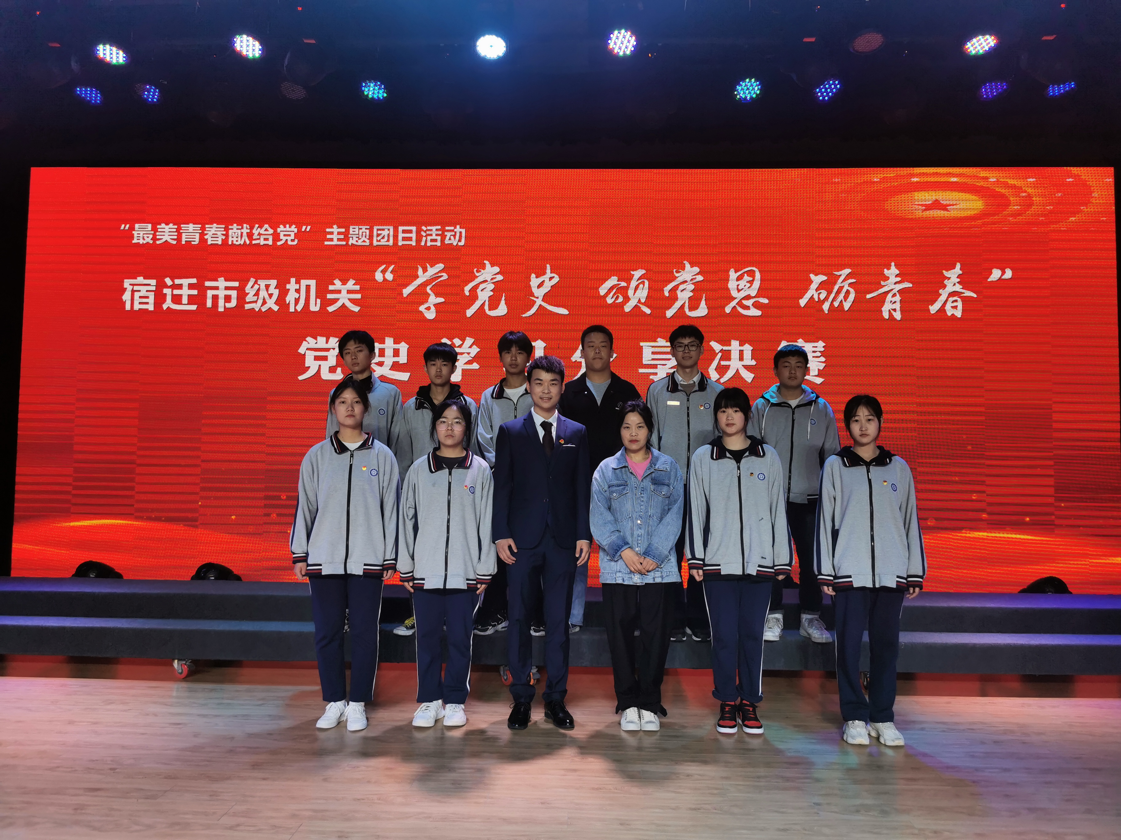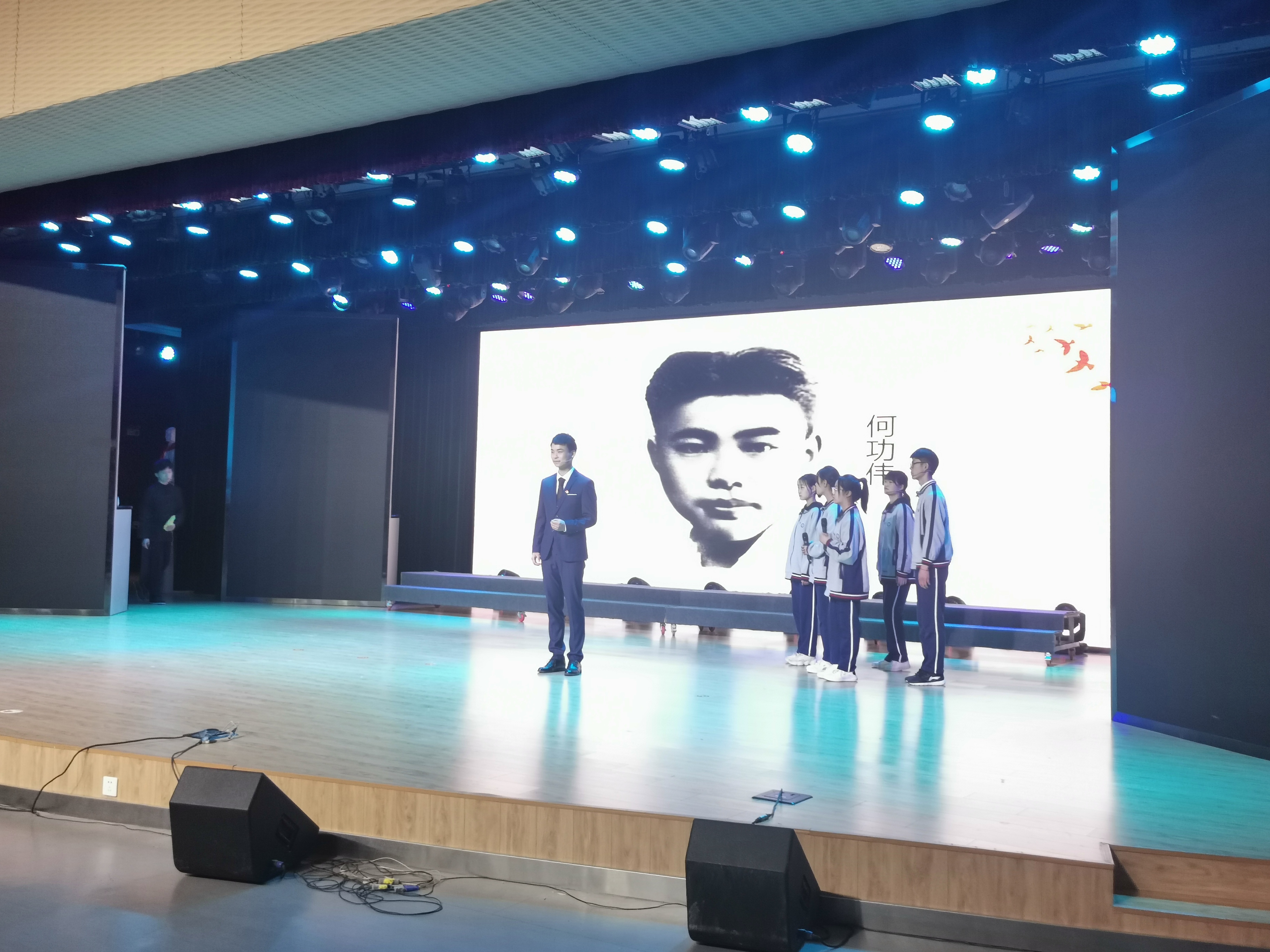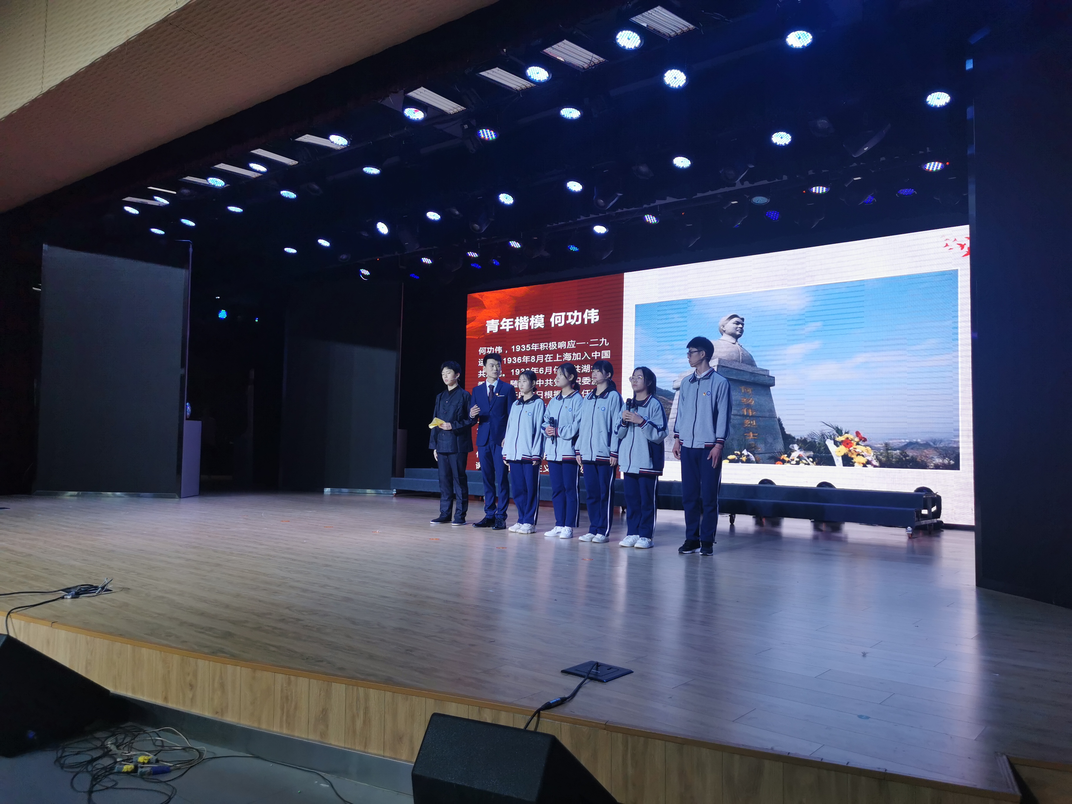 来自基础部的卢建中老师及10名青年学生代表,经过前期精心准备,在节目中用主题演讲结合情景展示的形式,结合灯光、舞美等多维元素,再现革命先烈——何功伟的感人事迹以及生命最后的毅然抉择。大家全情投入,在短短8分钟内,向现场观众展示了一名共产党员的坚韧与伟大。在决赛舞台上以极具感染力的表现,赢得了现场观众的一致称赞,并获得决赛三等奖的优异成绩。