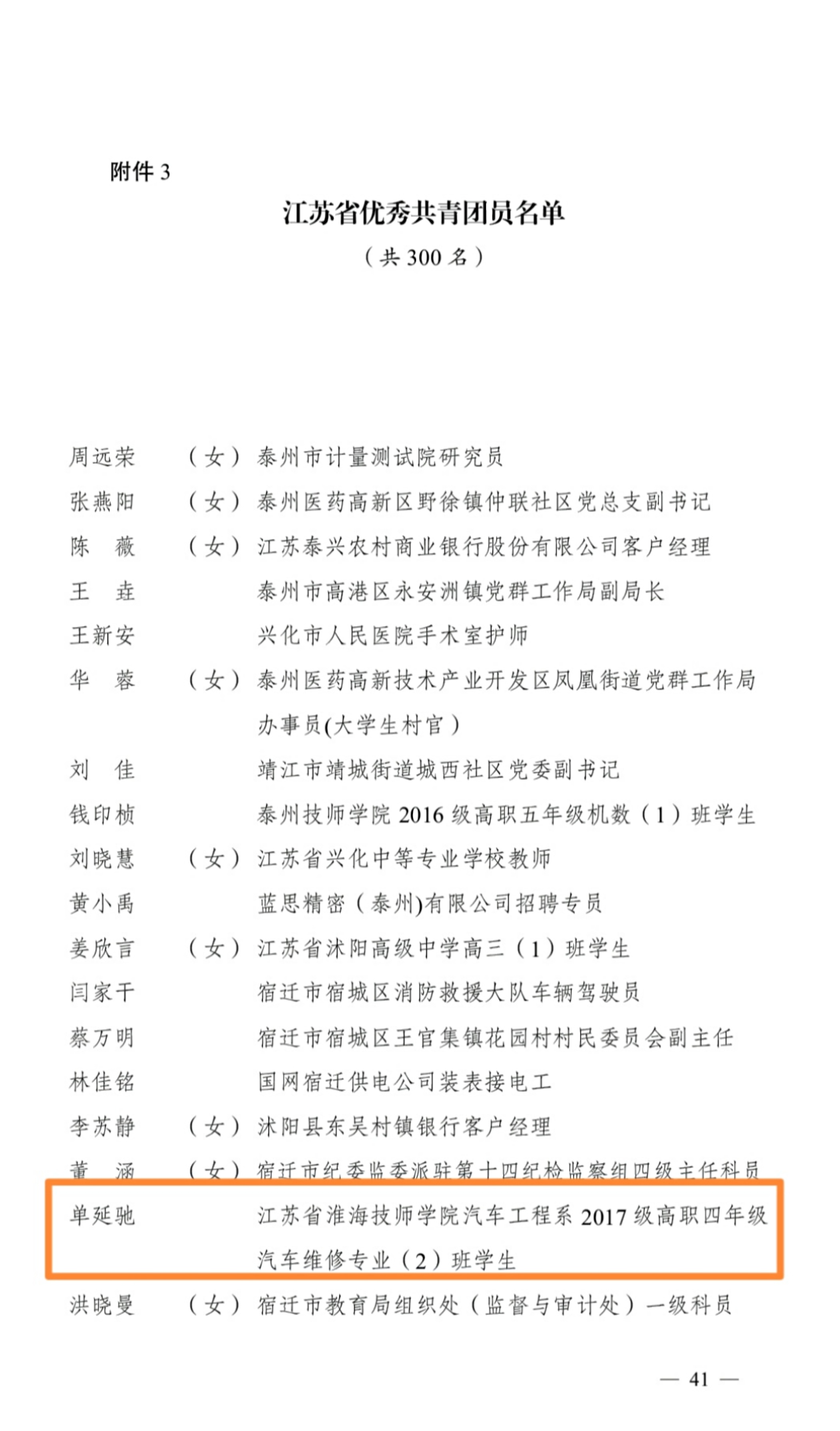 为庆祝中国共产党成立100周年,在“五四”青年节来临之际,共青团江苏省委下发《关于表彰江苏省五四红旗团委(团支部)、优秀共青团员、优秀共青团干部的决定》,我院汽车工程系17级汽车维修专业单延驰同学荣获“江苏省优秀共青团员”称号。