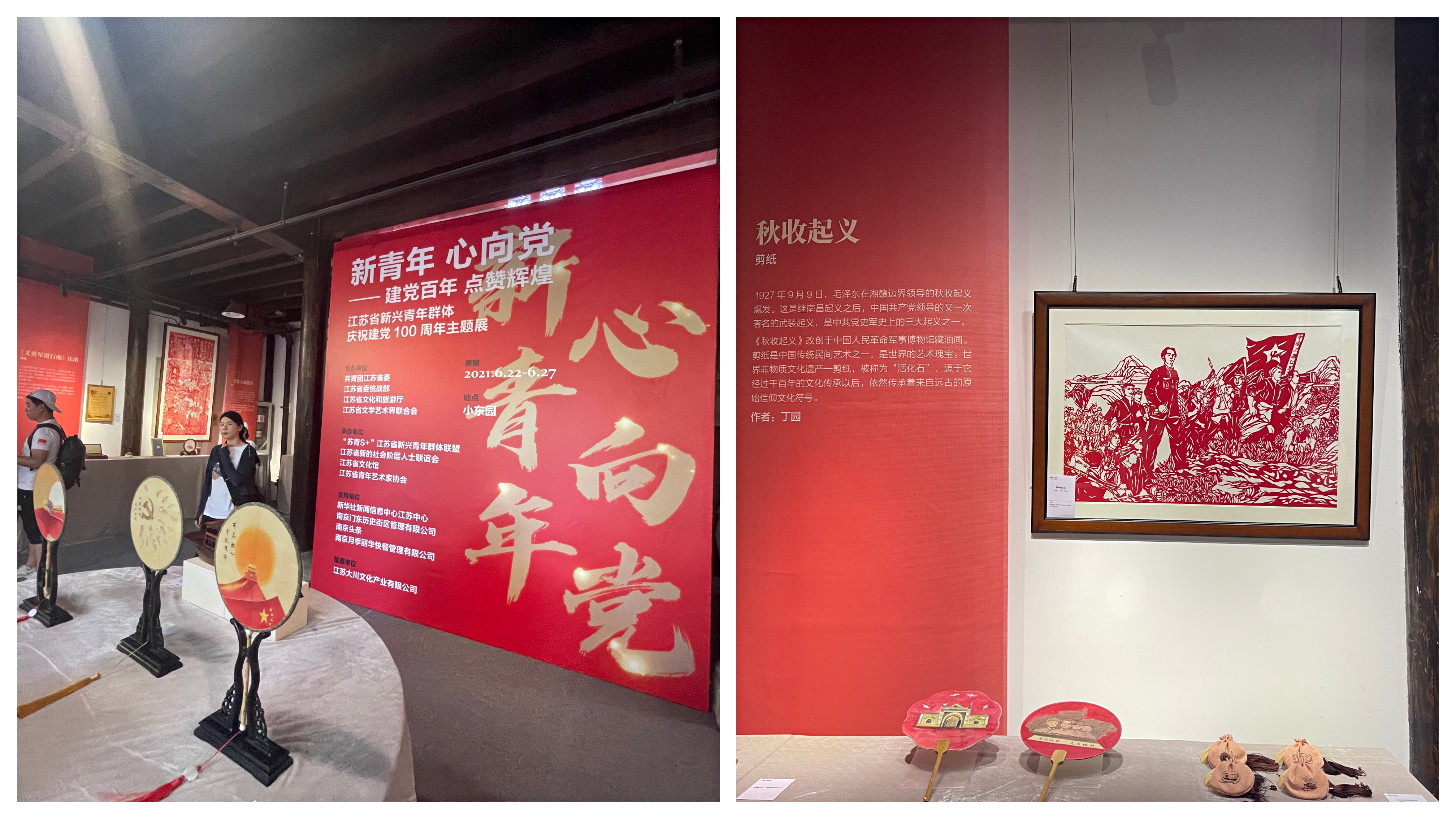 6月22日上午,由共青团江苏省委、江苏省委统战部、省文化和旅游厅、省文学艺术界联合会联合主办的“新青年 心向党——建党百年 点赞辉煌”江苏省新兴青年群体庆祝建党100周年主题展览在南京盛大开幕。我院剪纸历史经典产业特色班丁园老师携剪纸作品《攻占娄山关》、《秋收起义》受邀参与现场展览。
