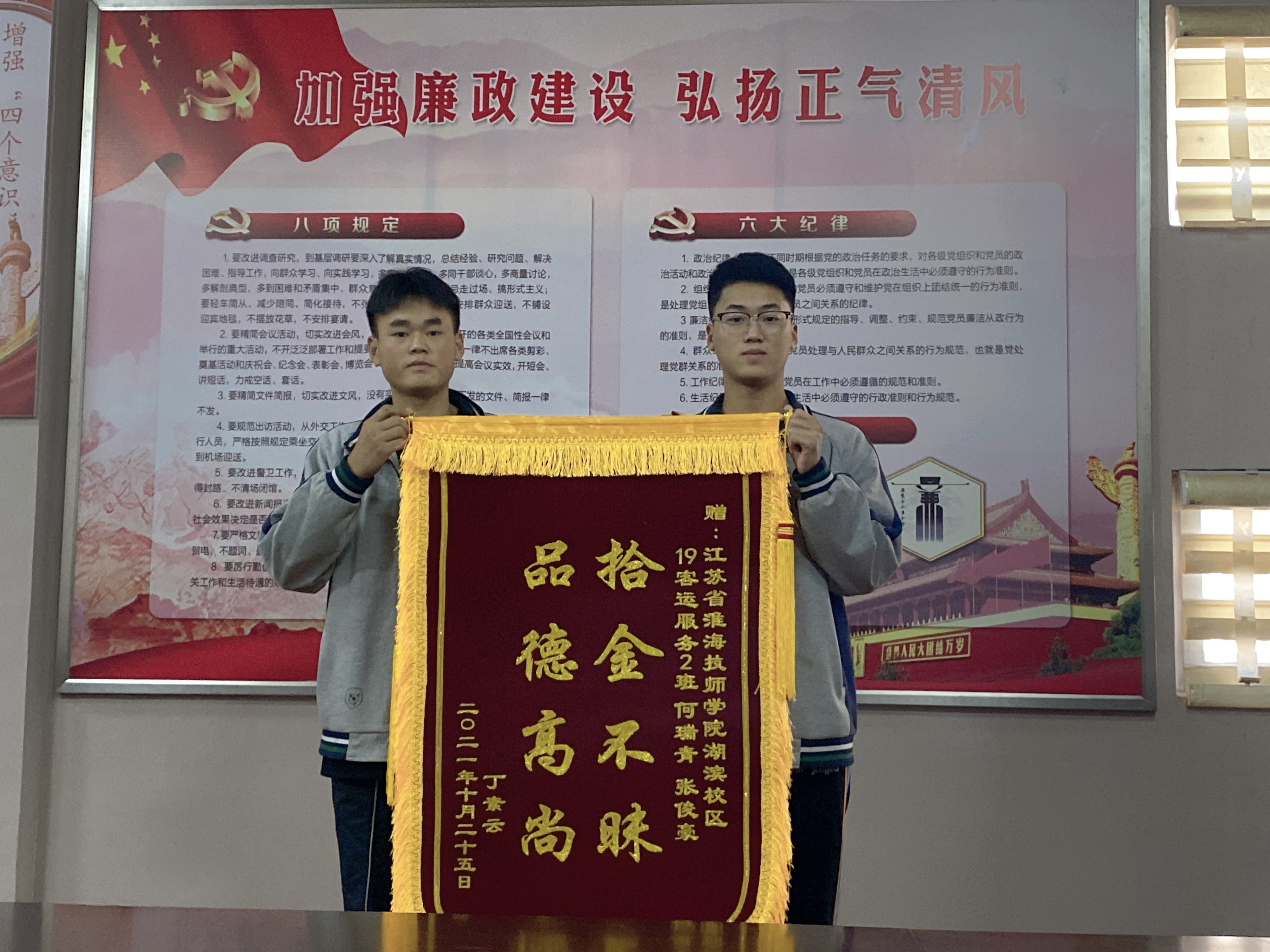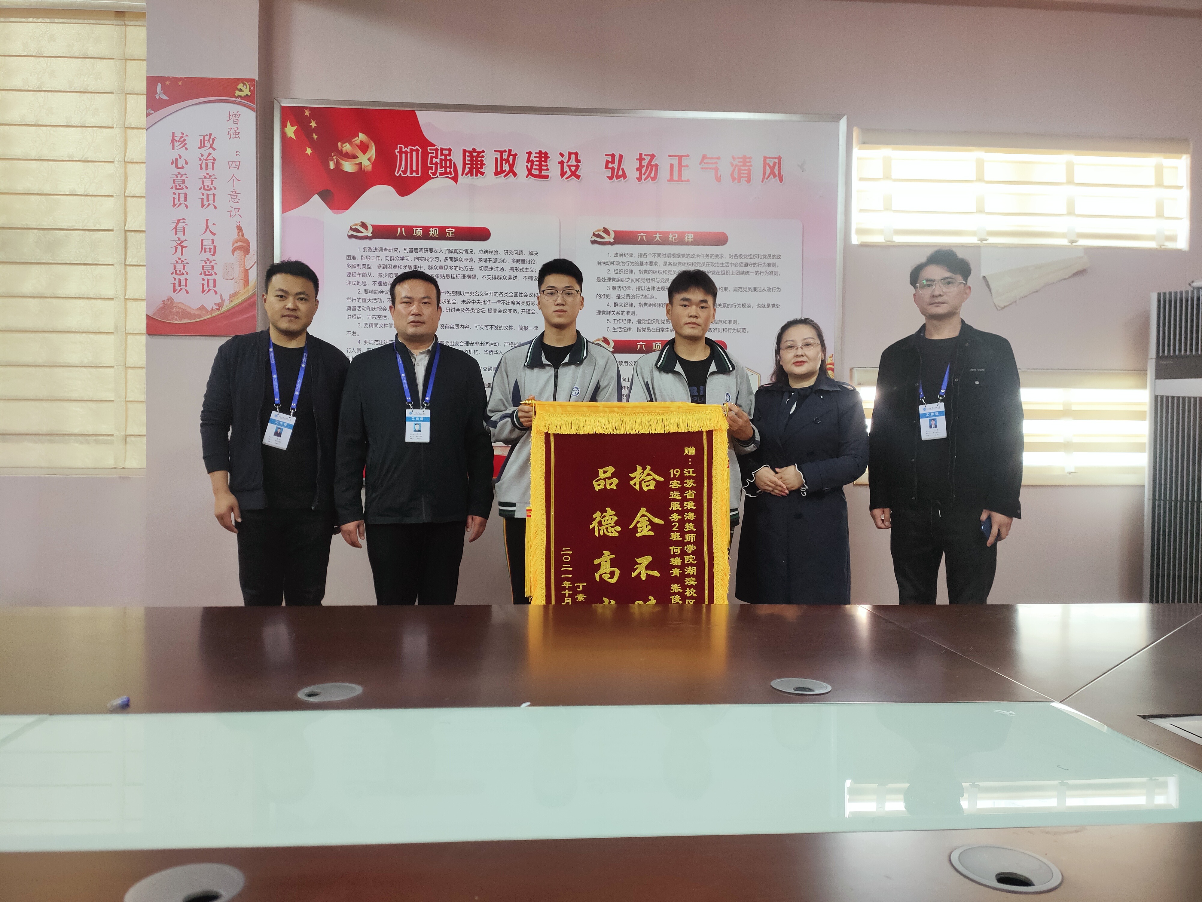 10月26日,在我院湖滨校区发生了令人暖心的一幕:只见失主丁素云将一面绣有“拾金不昧,品德高尚”的锦旗交到电子信息系张俊豪和何瑞青两位同学手中,脸上充满了感激之情。两位同学羞涩的接过锦旗,表示自己只是做了自己该做的事。