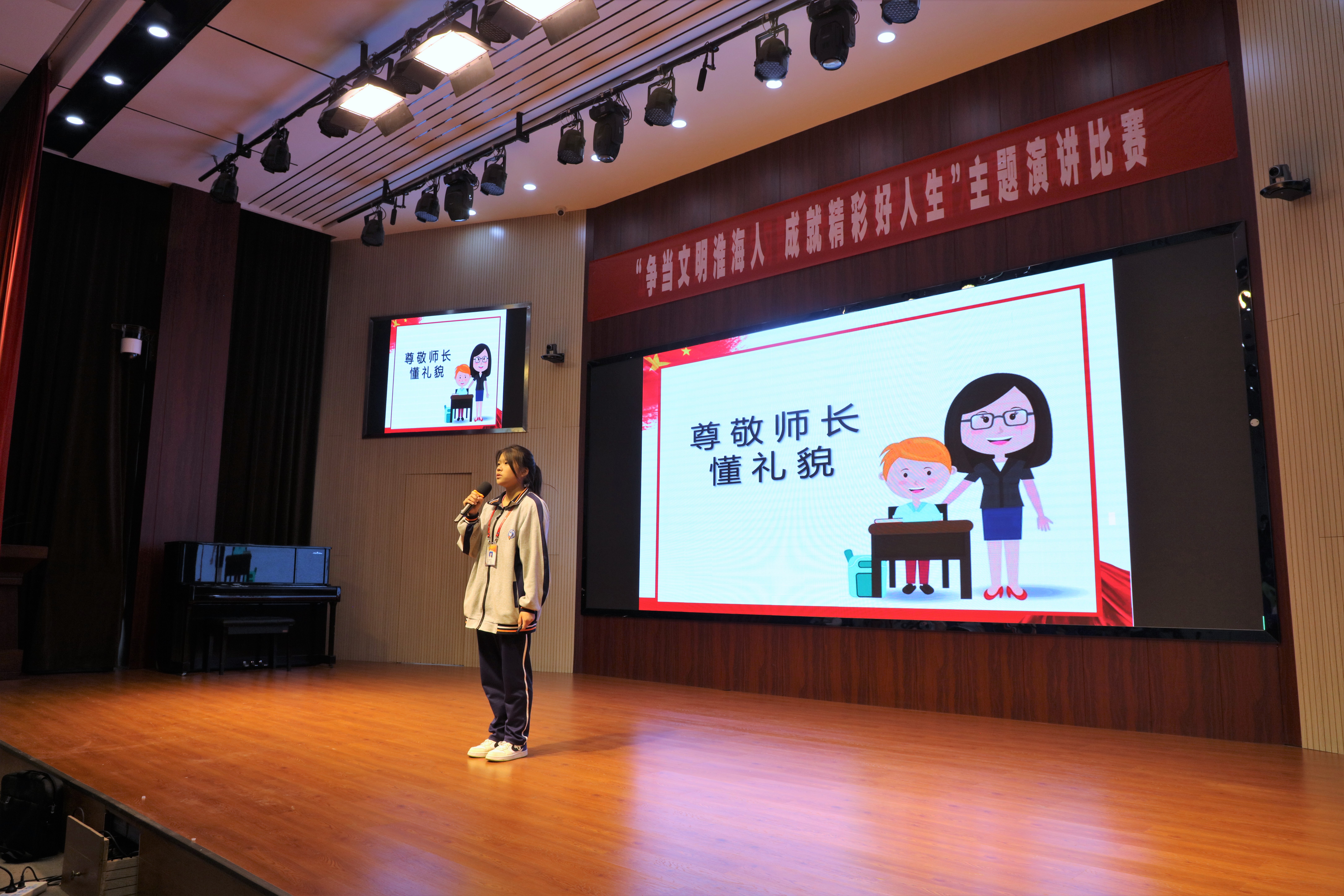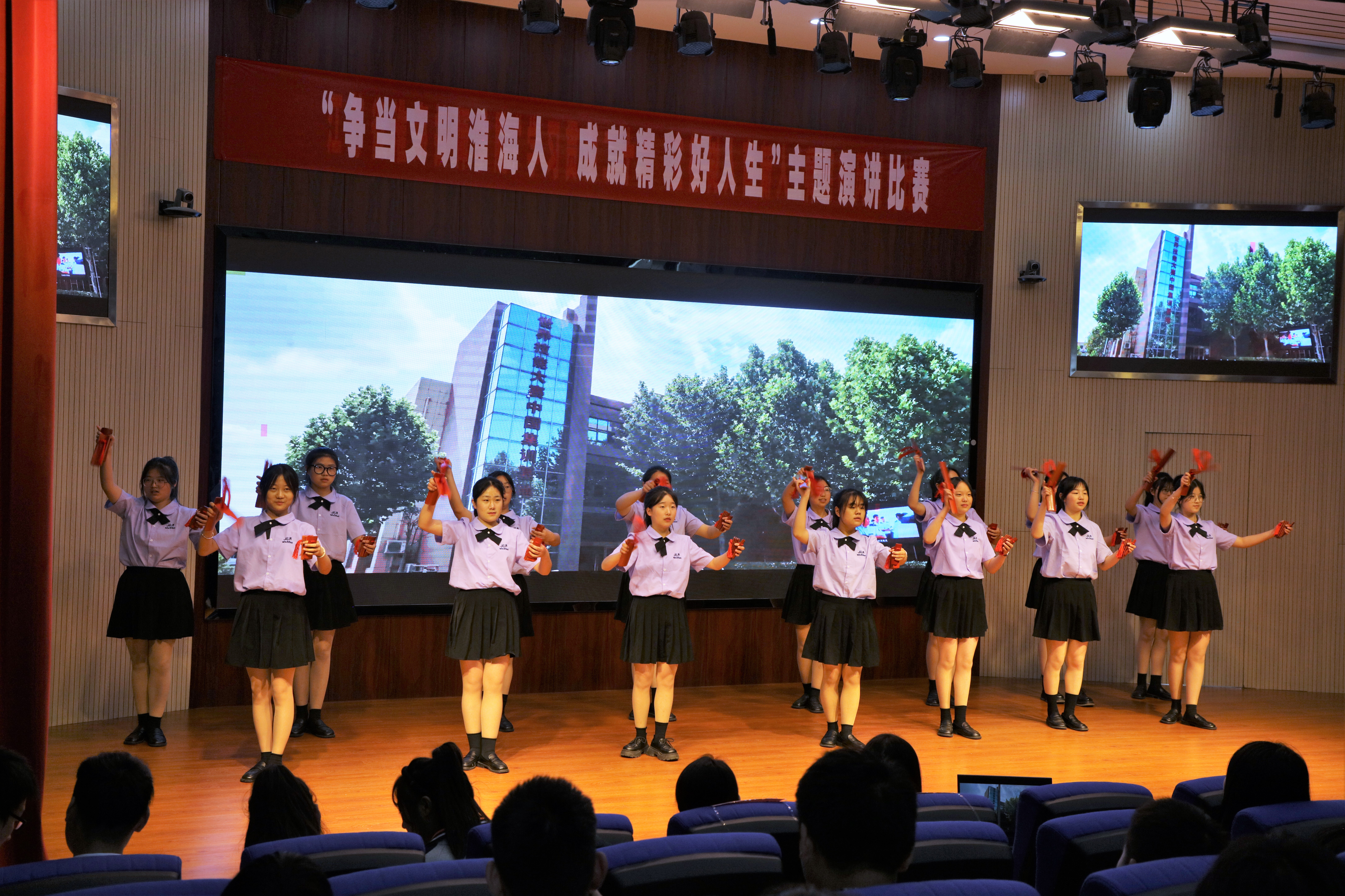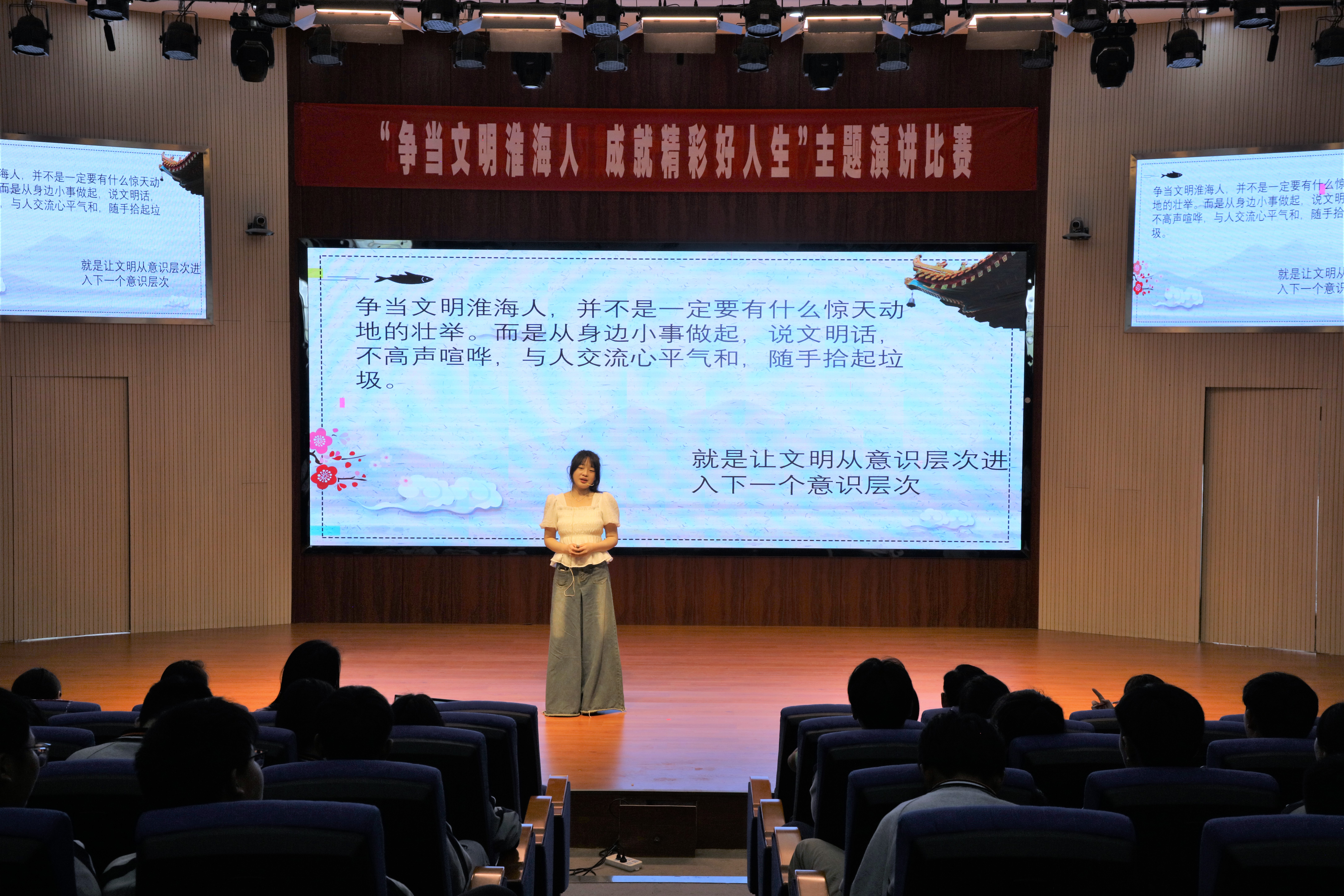 比赛现场,选手们紧紧围绕践行“淮海文明20条”等主题,立足于学习生活实际,结合身边生动的事例,以饱满的热情抒发自己对于文明行为规范的所学所得以及贯彻“淮海文明20条”的所行所悟。