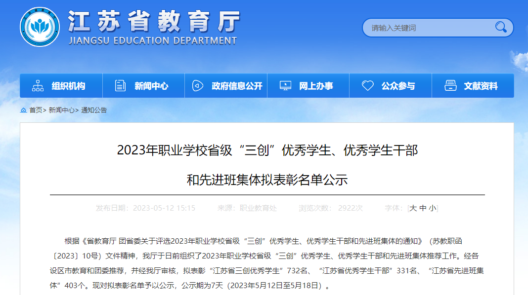 近期,省教育厅公示了2023年职业学校省级“三创”优秀学生、优秀学生干部和先进班集体拟表彰名单。我院多个班集体和学生荣获省级表彰。