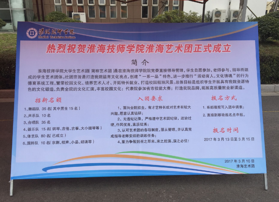 报名首日,便收到超过150份报名表,面对纷至沓来的“报名表”,艺术团委员会将于下周一,按组别对报名学生进行面试,面试分知识问答和才艺展示两部分,择优录取进入艺术团。在此,预祝同学们能在“淮海艺术团”这个平台抓住机会,磨练自己,把握在学校里的黄金时期,注重个人综合能力的发展,为自己、为学院创造辉煌的未来。