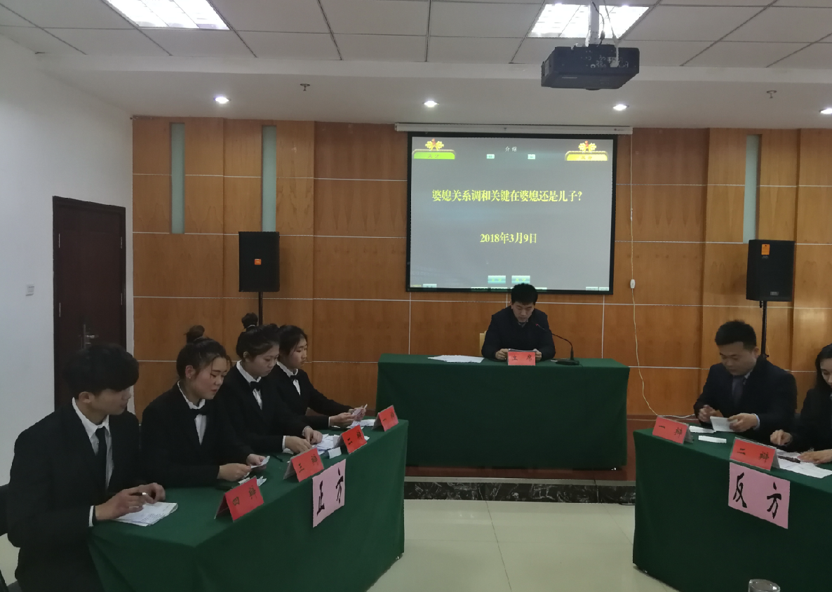 本场辩论赛围绕“家庭婆媳关系中调和的关键因素是婆媳还是儿子”展开。我院辩论队作为正方认为“婆媳关系的调和的关键因素是婆媳”;产发集团辩论队作为反方认为“婆媳关系的调和的关键因素是儿子”。整场辩论赛中,我院辩手从辩题的定义以及意义出发,从现代家庭伦理关系以及哲学思想入手,用案例、典故以及数据表明婆媳关系调和的关键为婆媳本身,与对手展看了精彩的辩论。在阵阵掌声中,展现的不仅是辩手的个人能力,更体现了四位辩手之间互相信任、相互协作的团队精神;而场上从未间断的问答,体现了辩手对于辩题的理解与思考,更凸显出我院辩论队“训练时精心准备,赛场上随意展示”的追求。
