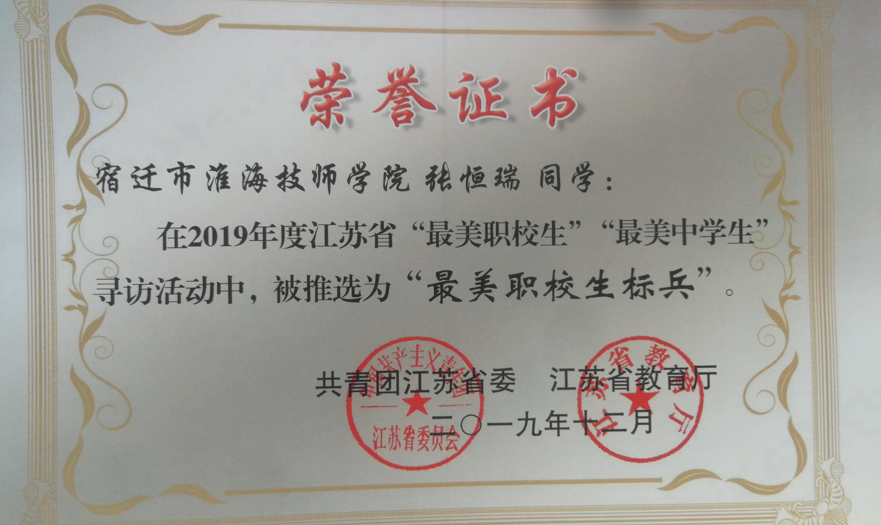 “寻访2019年度‘最美中学生’‘最美职校生’”活动于2019年6月启动,面向全国中学、职业院校(技工院校)在校学生,寻访在热爱祖国、勤奋学习、科技创新、技术技能、志愿服务、热心助人、见义勇为、诚信友善、孝老爱亲、自强自立等方面表现突出的、自觉树立和践行社会主义核心价值观的“最美中学生”和“最美职校生”。张恒瑞同学凭借自立自强,展现新时代技工院校学子践行工匠精神的青春事迹——《追求卓越,成就工匠人生》,从校级寻访活动开始,一路荣获学院“最美学生”、宿迁市“最美职校生”。此次,又在省级的舞台上绽放光芒,成功获评2019年度“江苏省最美职校生标兵”称号。