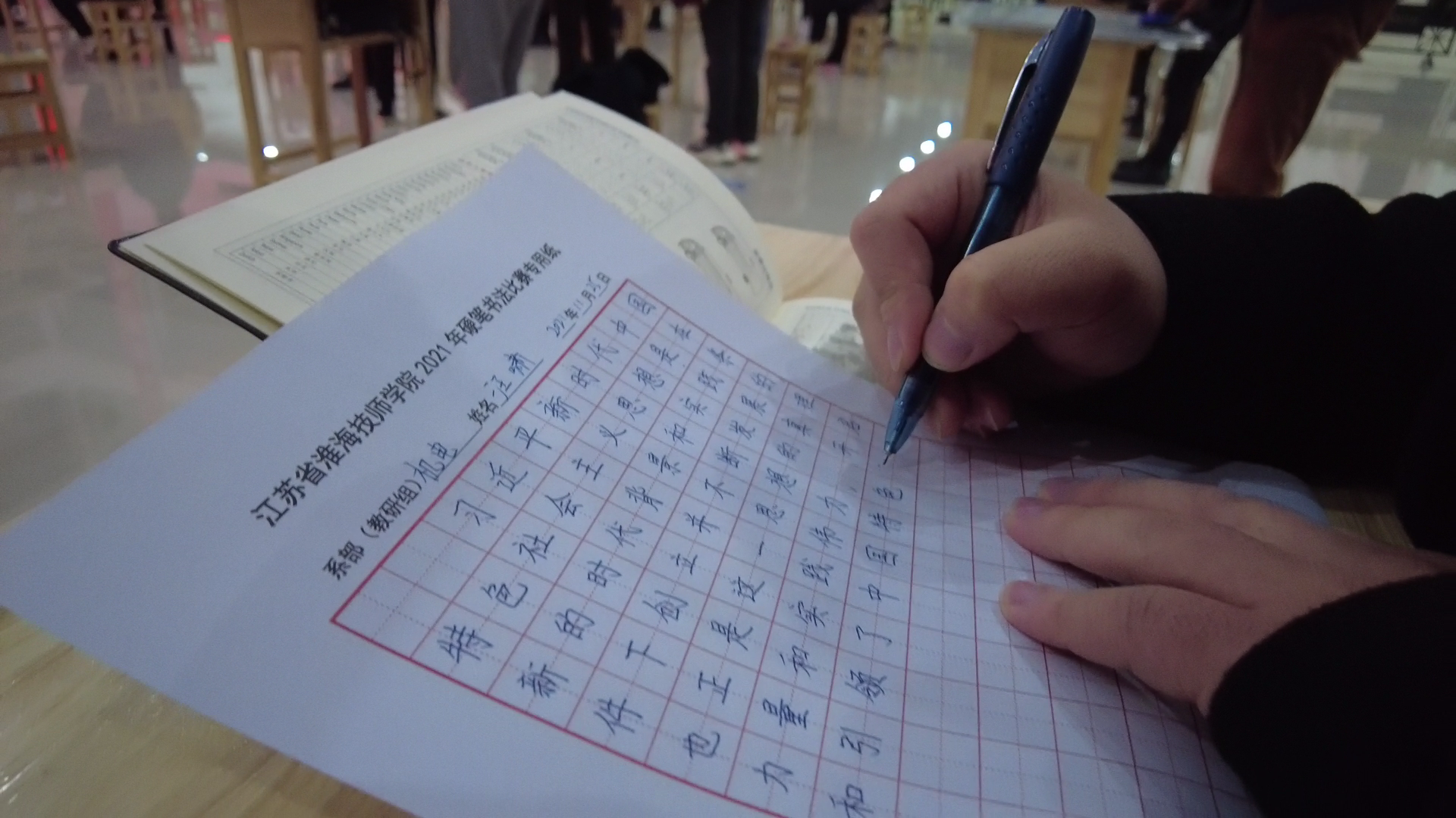 “三笔字”分别是指毛笔字、钢笔字、粉笔字。比赛分为预赛、决赛、展示三个阶段。预赛由各系部和公共课教研组分别组织、初评,书写内容均为党史学习教育相关题材,参赛人员覆盖了学院9成以上的教职工。