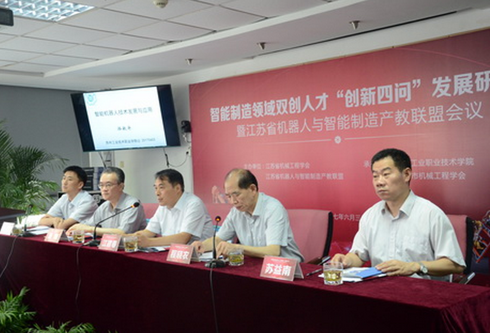 6月3日,江苏省智能制造领域双创人才“创新四问”发展研讨会暨江苏省机器人与智能制造产教联盟会议在苏州工业职业技术学院举行。会议由江苏省机械工程学、江苏省机器人与智能制造产教联盟主办,苏州市机械工程学会、苏州工业职业技术学院承办,省机械工程学会及各专业分会、各市机械工程学会、各有关院校企业代表和特邀专家参加了会议,省机械工程学会副理事长兼秘书长江建春到会并致辞。我院院委会成员、教务处处长陈元文应邀参加会议,并作“国家职业教育产教融合项目——工业机器人实训基地建设”专题发言。