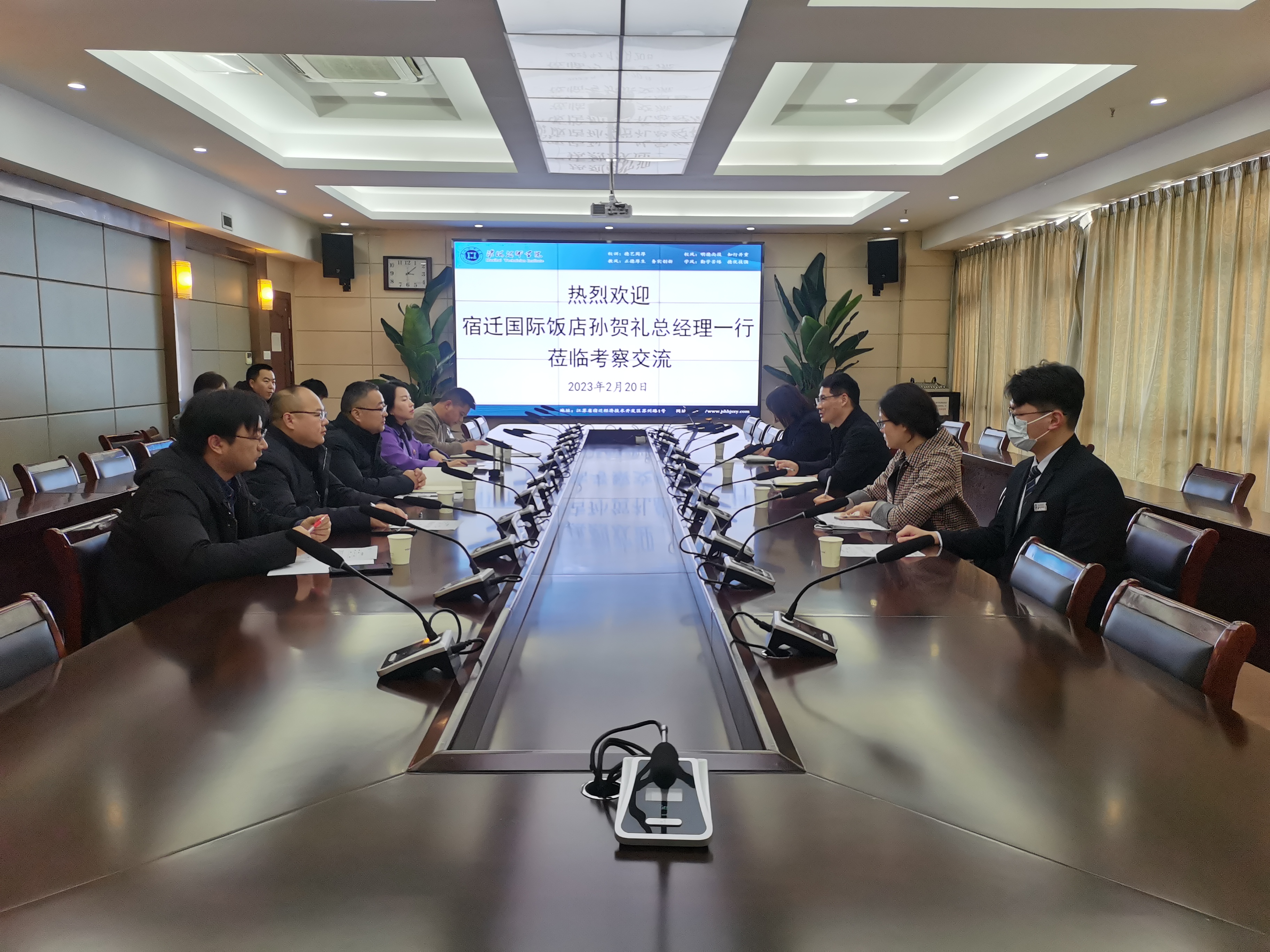 2月20日下午,宿迁国际饭店有限公司党支部书记、总经理孙贺礼等一行来我院考察交流,洽谈校企合作、学生实习就业等事宜。学院副院长李刚、王坤,招生就业处、商贸旅游系、现代服务系等部门负责人参加座谈交流。