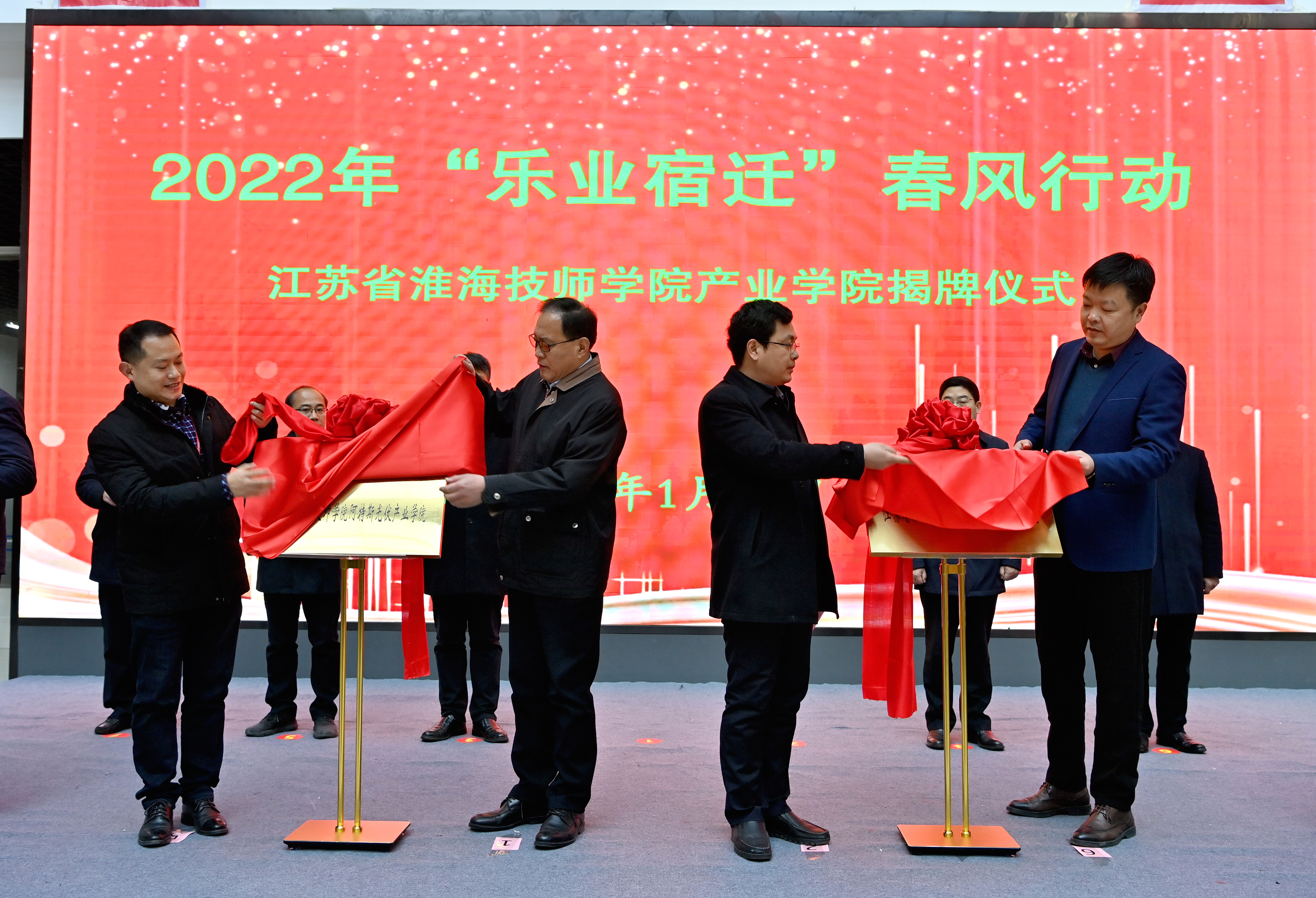 1月13日上午,我院举行产业学院揭牌仪式。市政府副市长曹秀明,市政府副秘书长王光宇,市人社局党组书记、局长钱信松,学院党委书记、院长张兵营与宿迁阿特斯阳光能源科技有限公司总经理贾敏、江苏京东校企合作总经理蒋继禹、江苏易道文创发展有限公司董事长陆涧、江苏苏驰集团董事长孙红军共同为“阿特斯光伏产业学院”、“京东电商产业学院”、“网易传媒产业学院”、“苏驰汽车产业学院”揭牌。