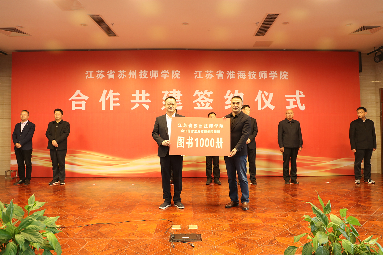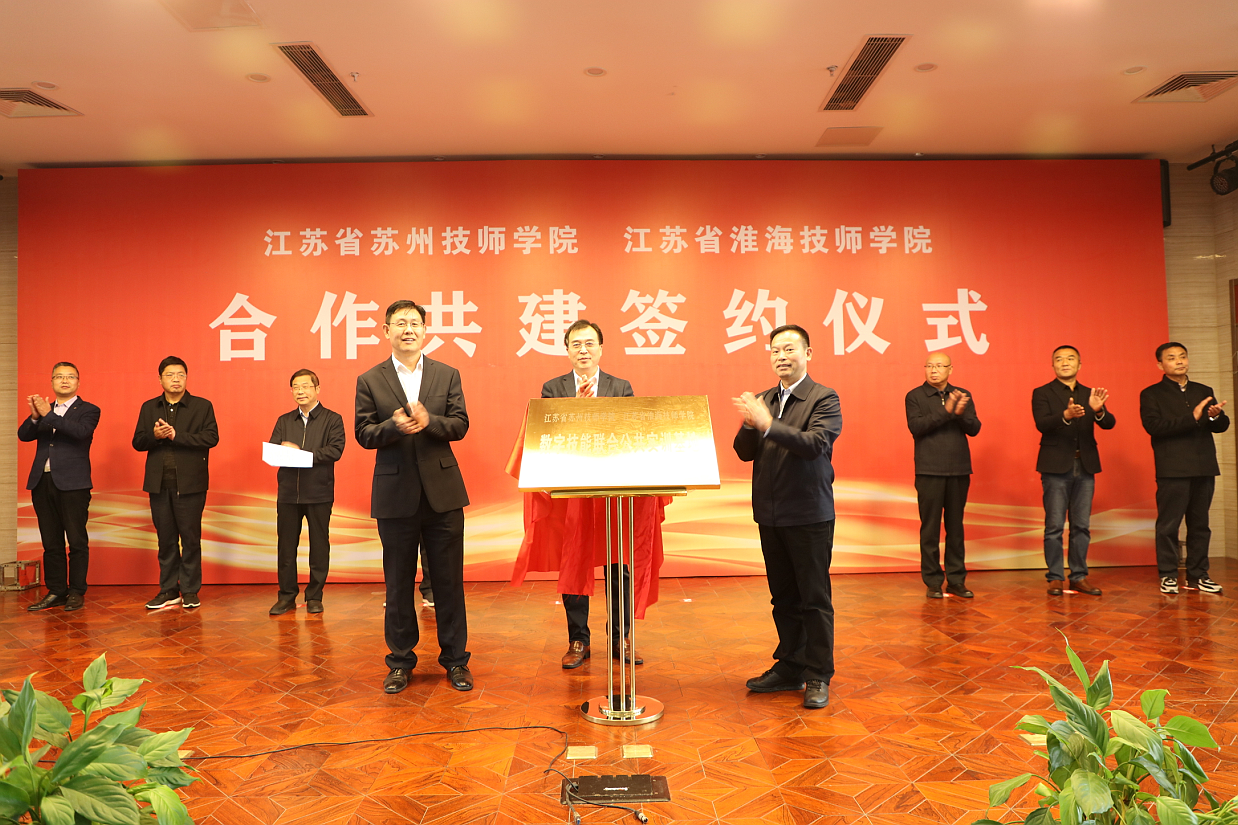 李军和顾正明分别代表双方在合作共建协议书上签字。钱信松、顾正明、李军共同为“数字技能联合公共实训中心”揭牌。江苏省苏州技师学院向我院赠送1000册专业书籍。