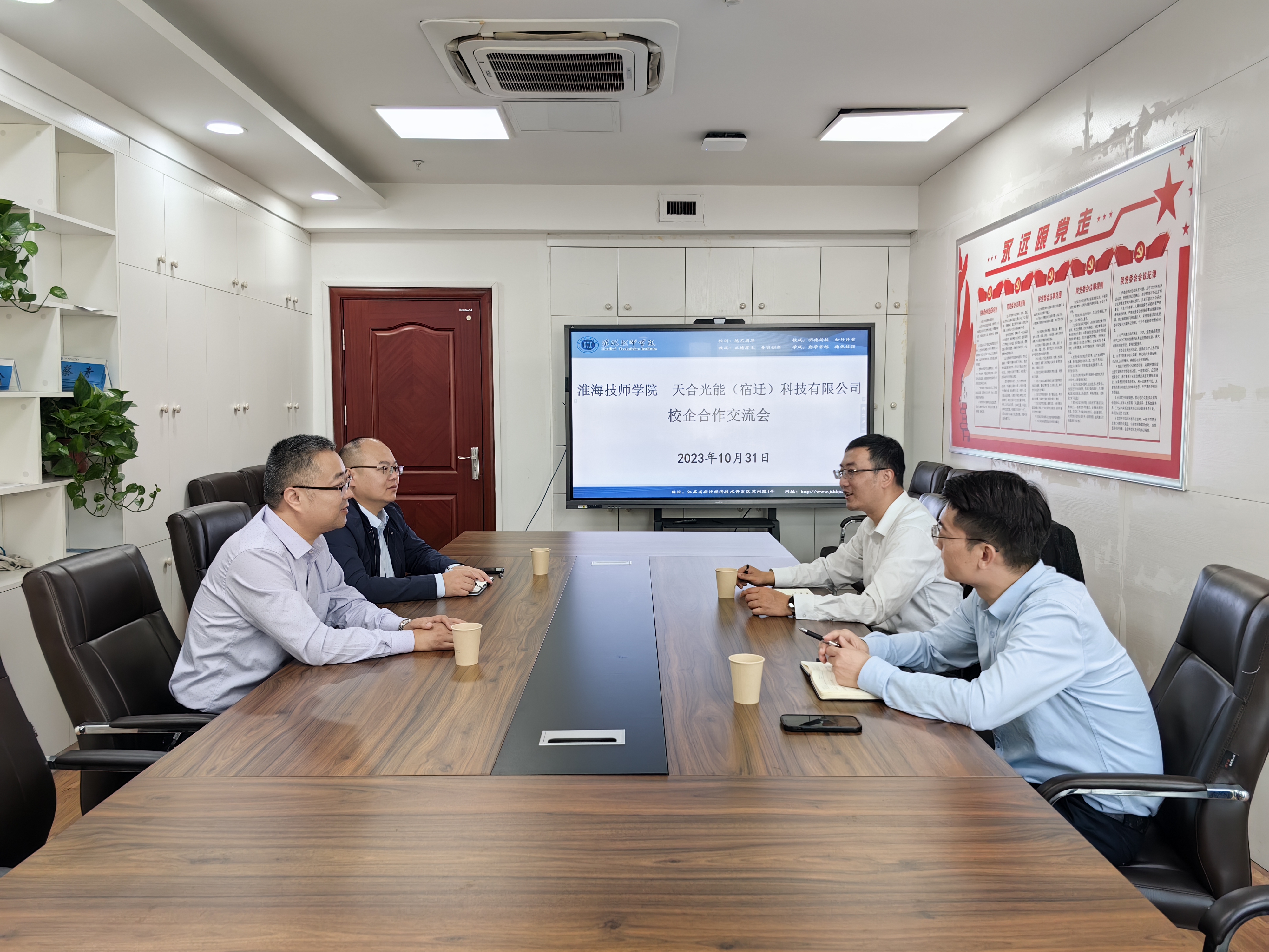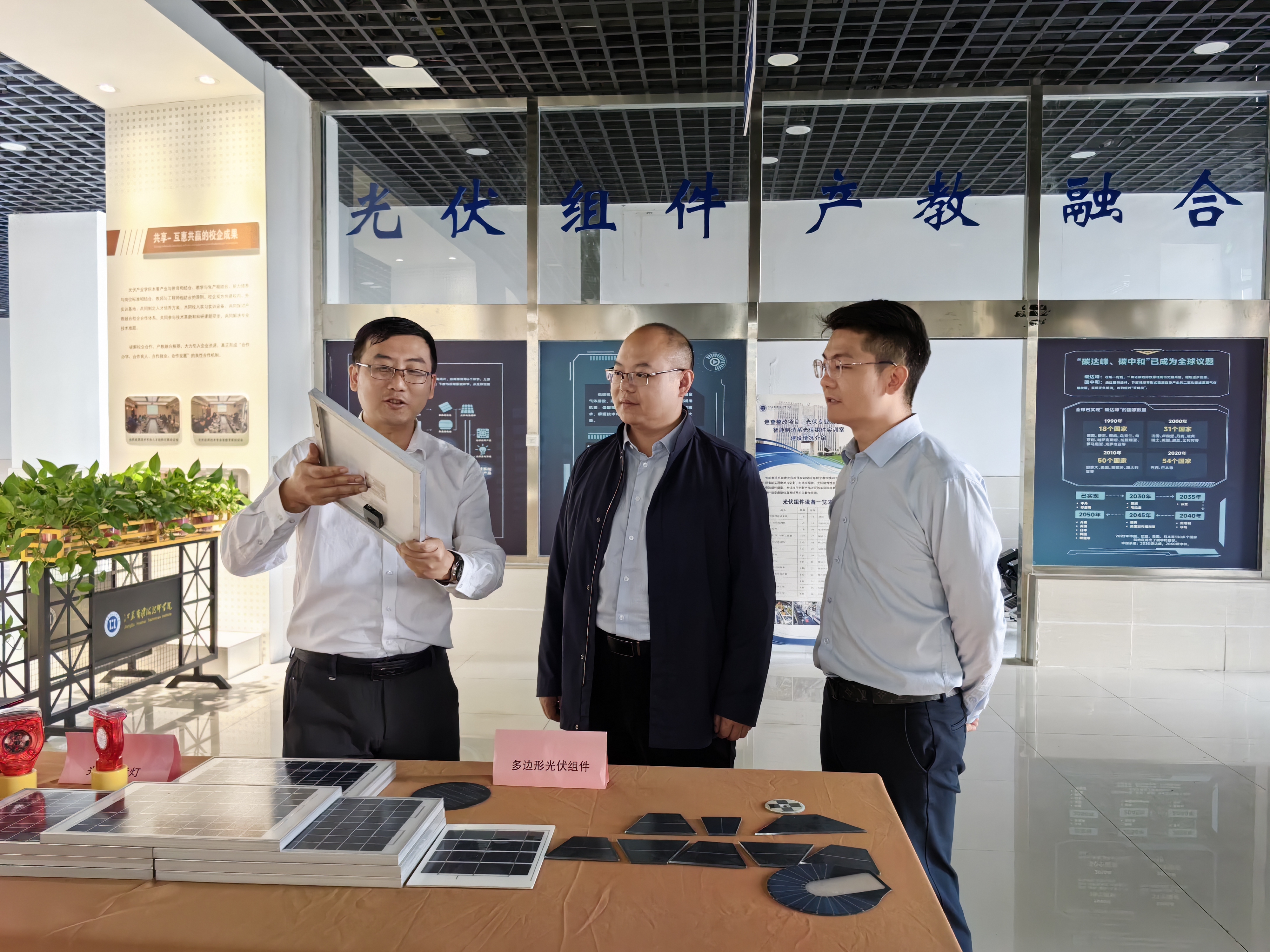 双方就校内光伏组件实习生产线建设中面临的问题及下一阶段重点工作等相关细节进行了深入沟通交流,达成了一致意见。