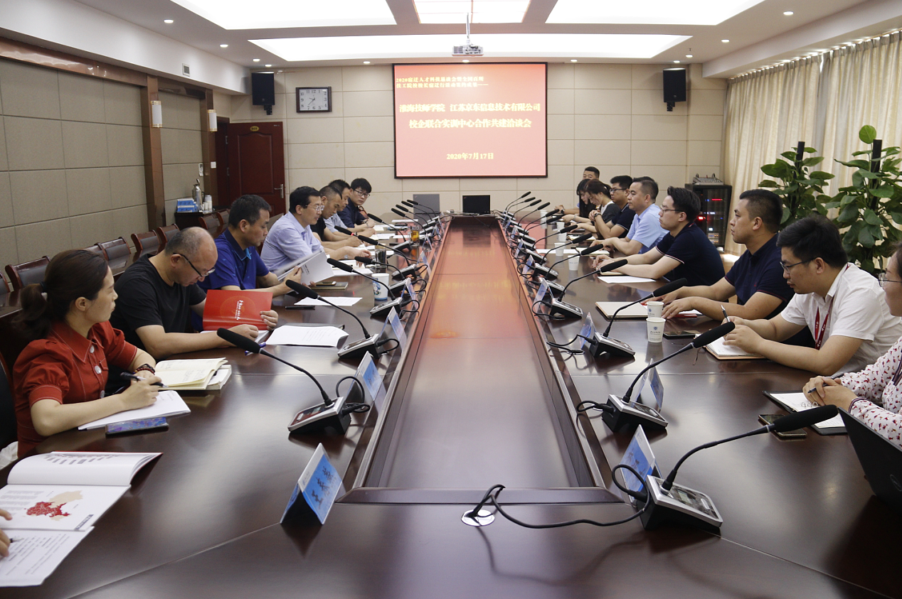 7月17日上午,京东全国客服中心党委书记、人力资源行政总监汪世龙一行11人来我院参观交流,洽谈电子商务校企联合实训中心、京东校园馆创新项目建设,进一步细化合作内容,推动2020宿迁人才科技恳谈会暨全国百所技工院校校长宿迁行活动成果落实落地,开启校企合作新模式。学院院长、党委副书记张兵营出席洽谈会。党委委员、副院长、党政办公室主任朱宇亮主持活动。院委委员、工会主席胡柯,教务处、招生就业处、电子信息系等相关部门负责人参加座谈交流。