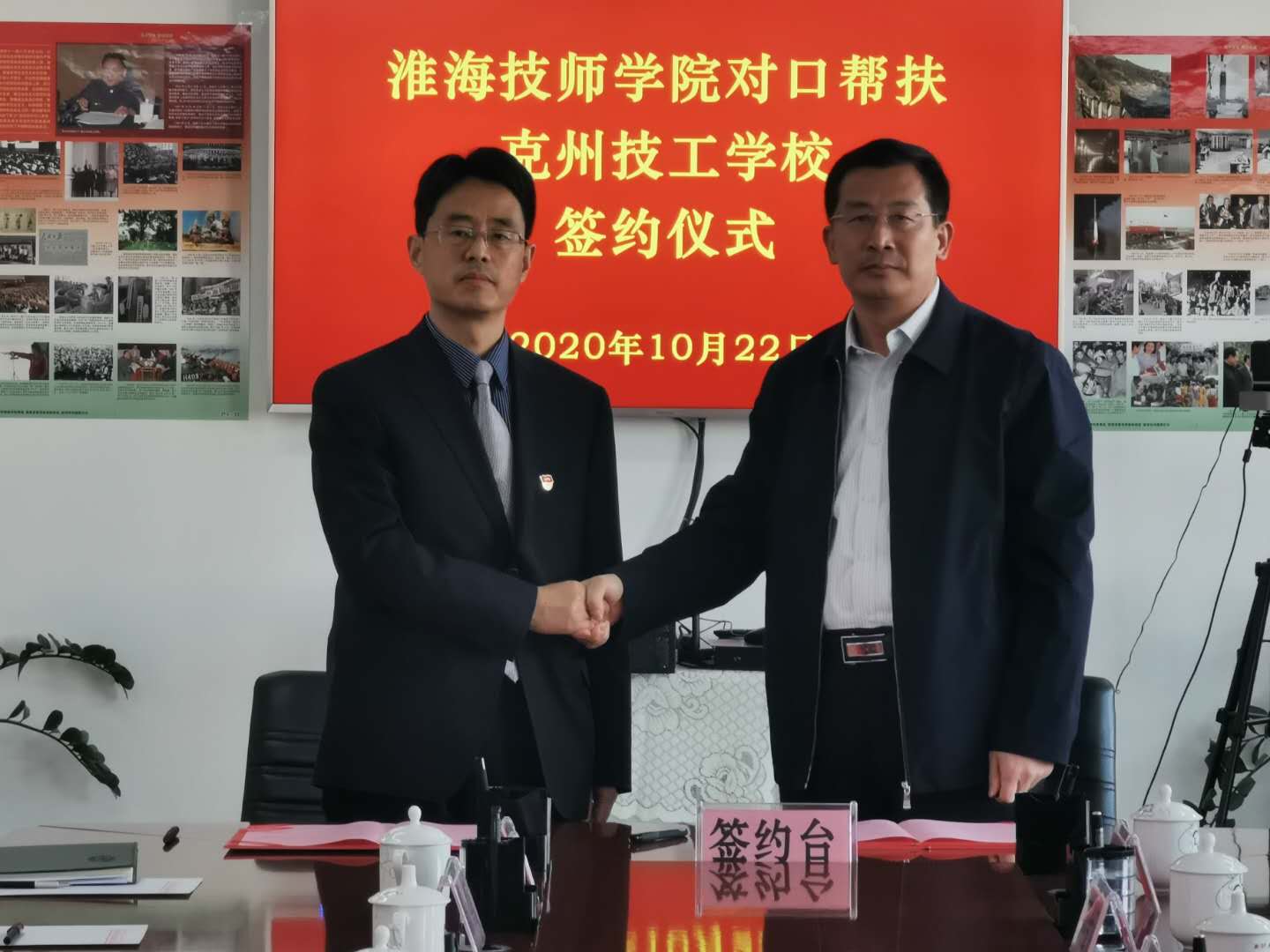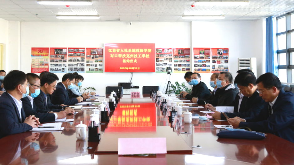 对口帮扶克州技工院校建设是江苏援疆工作的重要组成部分,是实施技能扶贫行动的重要举措,是帮助克州促进就业、改善民生的重要基础。为了更精准地实施上述帮扶项目,10月20日至23日,江苏省人社厅副厅长顾潮率领全省10所重点技工院校负责人赶赴新疆克州,对当地技工院校建设情况开展实地考察和座谈交流,随后深入到每一所受援学校调研,并逐一现场签署对口帮扶协议。根据省厅部署,我院对口帮扶克州技工学校(克孜勒苏职业技术学院)。10月22日上午,顾潮率江苏省人社厅考察团一行抵达克州技工学校,参观考察之后在该校图书馆会议室召开座谈会,并举行了简短而隆重的对口帮扶签约仪式,我院与克州技工学校正式结成全面对口支援伙伴关系。