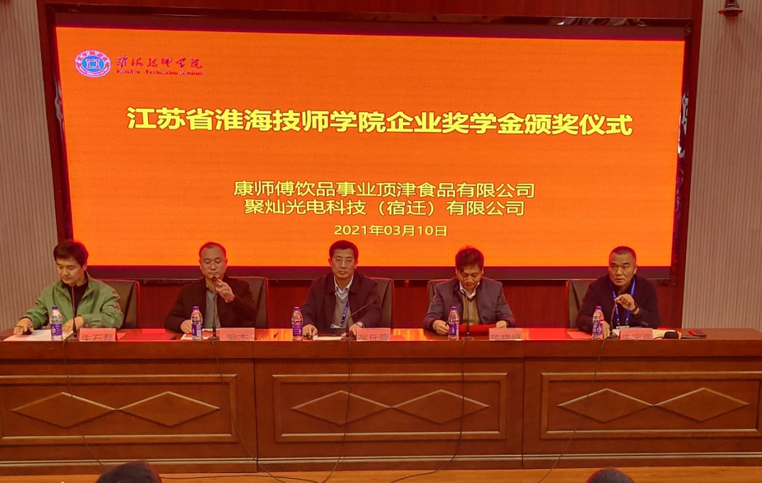 3月10日下午,我院与康师傅饮品事业顶津食品有限公司、聚灿光电科技(宿迁)有限公司联合举行企业奖、助学金颁发仪式。学院院长张兵营、副院长朱宇亮出席颁发仪式,康师傅饮料江苏地区生产总经理陈晓斌,聚灿光电科技(宿迁)有限公司人事经理罗杰,康师傅饮料宿迁顶津食品有限公司厂长朱石磊等参加颁发仪式。